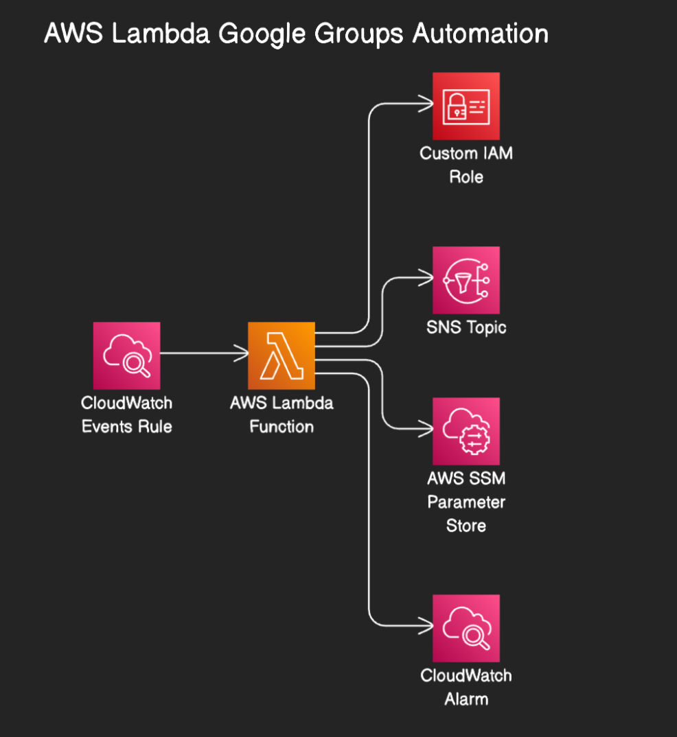 Serverless automation using AWS SAM to manage Google Groups with scheduled execution and comprehensive monitoring.